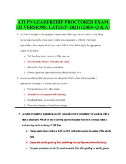 This extensive ATI PN Leadership Proctored Exam resource offers 32 of the most recent versions used in 2021, featuring over 2,100 authentic and verified questions and answers. Designed for Practical Nursing students preparing for their leadership assessment, it provides a strong foundation in critical leadership and management principles essential for real-world nursing roles.