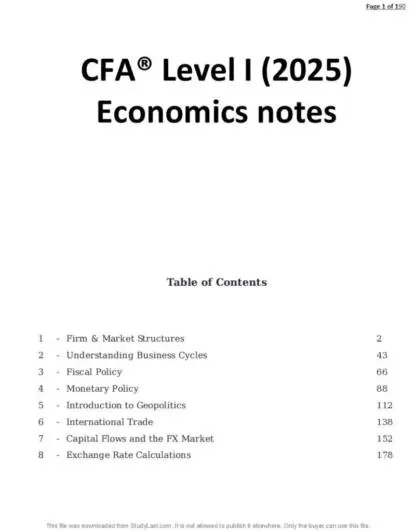 This 190-page document is a focused and structured summary of Economics for the CFA® Level I (2025) curriculum. Authored by a passed CFA candidate, it delivers exam-relevant content in a concise, review-friendly format tailored for serious candidates.