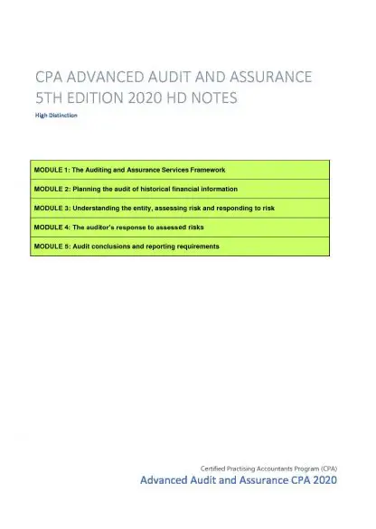 Very comprehensive and clean CPA Advanced Audit and Assurance (AAA) notes for the 5th edition. I have verified HD grades and you will find that you don’t even need to study the textbook if you have these notes with you. I’ve referenced all the pages and important facts. You only need these notes for the exam.