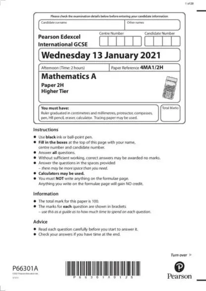 Edexcel International GCSE Mathematics A Paper 2H from 2021 January. Contains all 22 questions. No answers are provided.