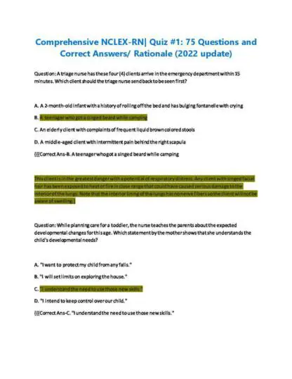 This Comprehensive NCLEX-RN Quiz #1 includes 75 updated practice questions with correct answers and rationales, tailored to prepare nursing students for the NCLEX-RN licensure exam. The quiz is built to reflect current test plan standards and clinical reasoning competencies tested by the National Council of State Boards of Nursing (NCSBN).